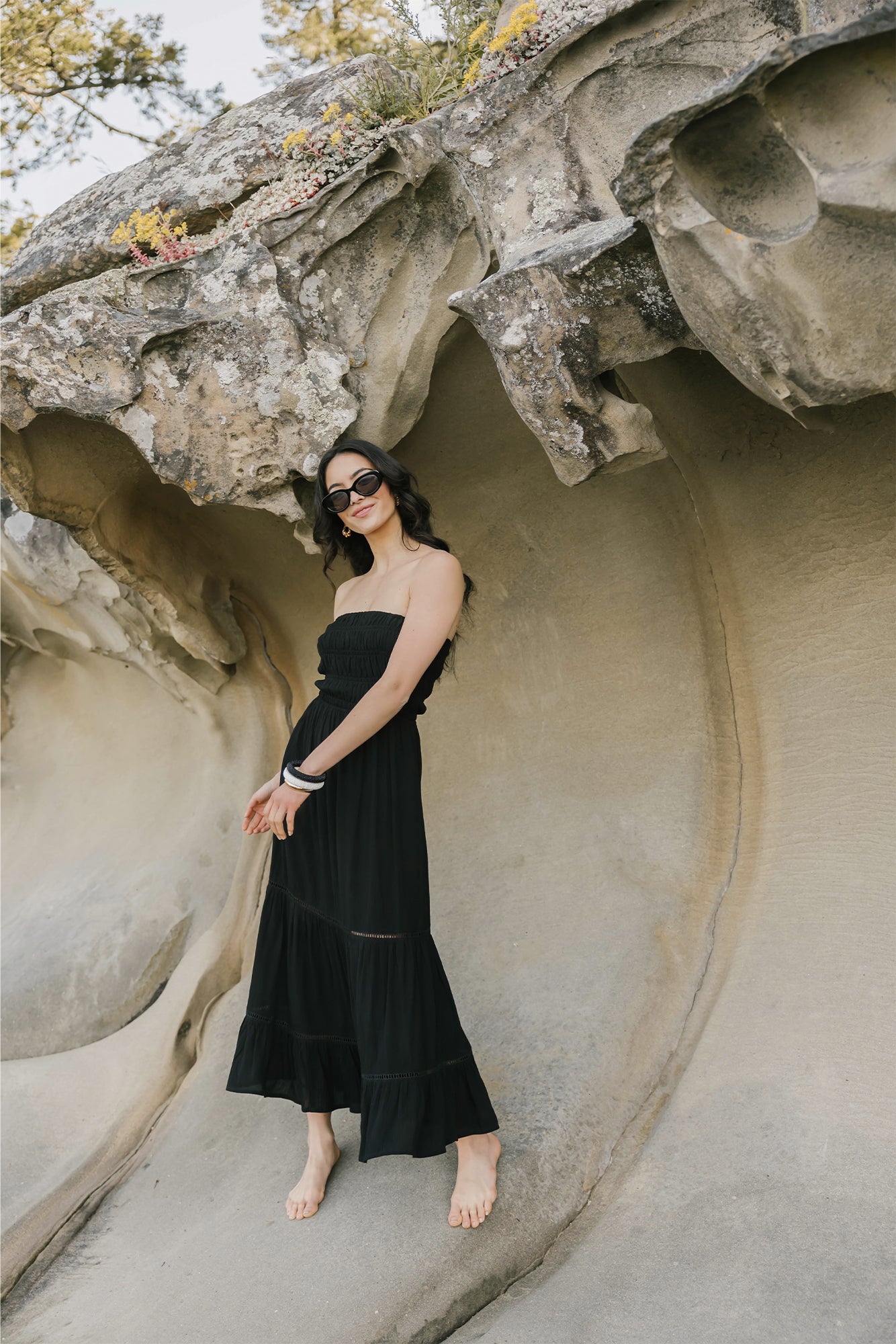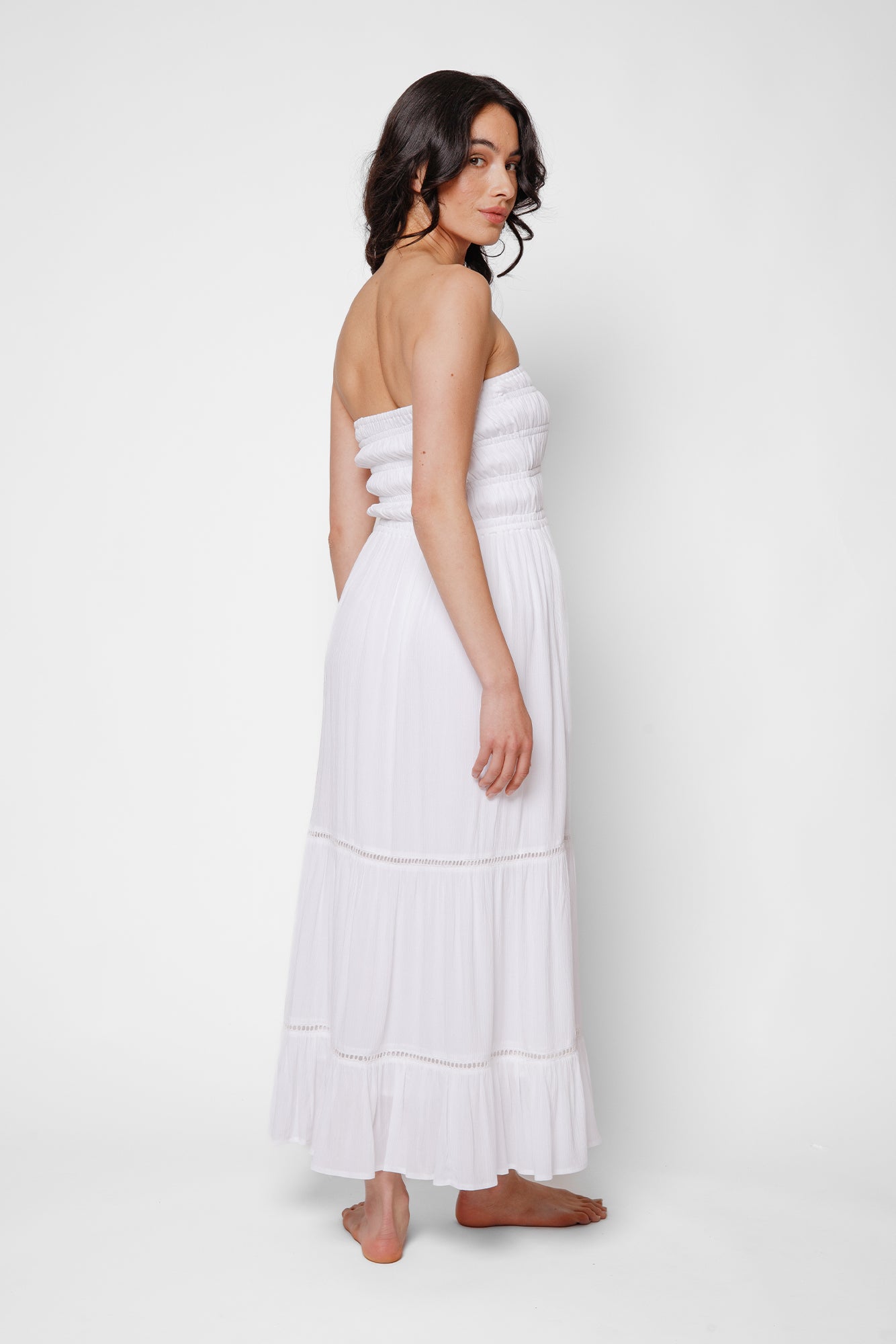 The Miami Luxe Smocked Tiered Dress is a flirty, feminine take on a best-loved silhouette. Featuring a comfortable, smocked bandeau-style bodice with removable and adjustable straps, this piece offers a customizable fit that flatters every shape. The flowing midi-length skirt is accented with delicate lace inserts between each tier, adding texture and movement to this breezy, sun-ready style—perfect for everything from beachside brunches to sunset strolls.