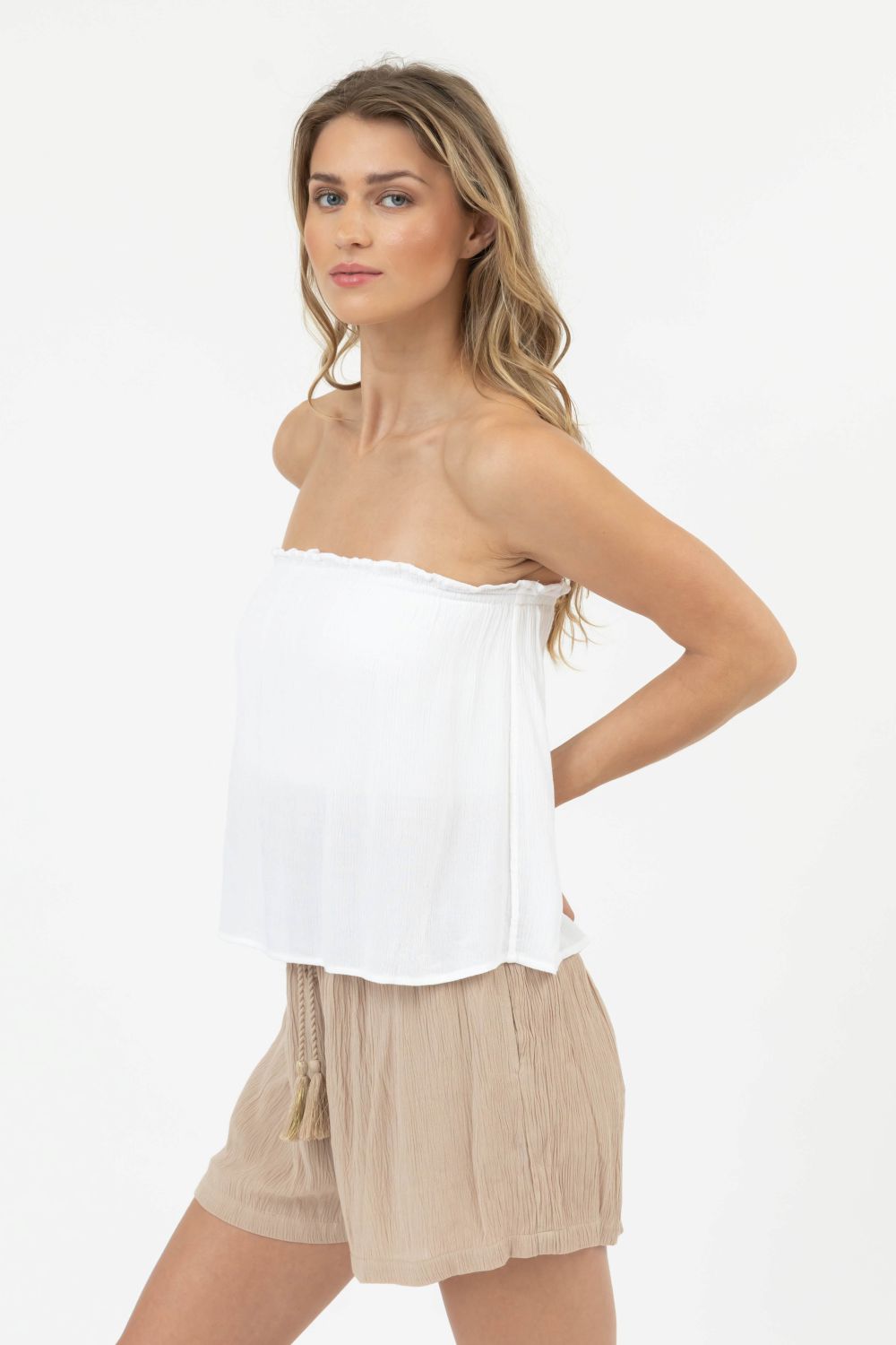 Turn heads in the Miami Bandeau Top! This chic piece features a soft smocked lining for a secure, flattering fit, topped with a flowing outer layer that drapes gracefully past the waist. A delicate ruffle trim along the top adds a flirty, feminine touch—perfect for pairing with high-waisted bottoms or your favourite summer skirt. (Effortless style, all day long!)