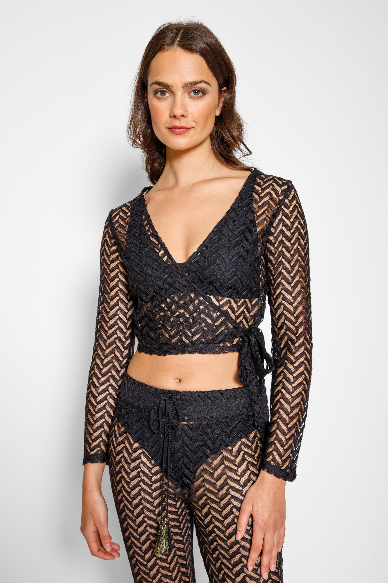 This Zuma Long Sleeve Wrap Top is all the rage and super versatile! With a trendy sheer crochet herringbone pattern, you can slay in this sassy cover up no matter what way you wrap it! Choose from natural white or black and be ready to look fierce in this one-of-a-kind, long bell-sleeved masterpiece.