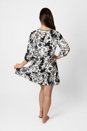 Soyez prête pour les vacances en un clin d'œil avec notre robe tunique fleurie à col en V Copacabana ! Cette robe trapèze ultra-séduisante arbore un imprimé floral hibiscus tropical accrocheur dans un onyx noir classique, ainsi qu'un col en V à pompons qui vous fera craquer. Idéale pour une escapade bien méritée ou pour tous les jours, sa rayonne délavée vous apportera fraîcheur et confort où que vous alliez ! Ça y est, nous voilà !