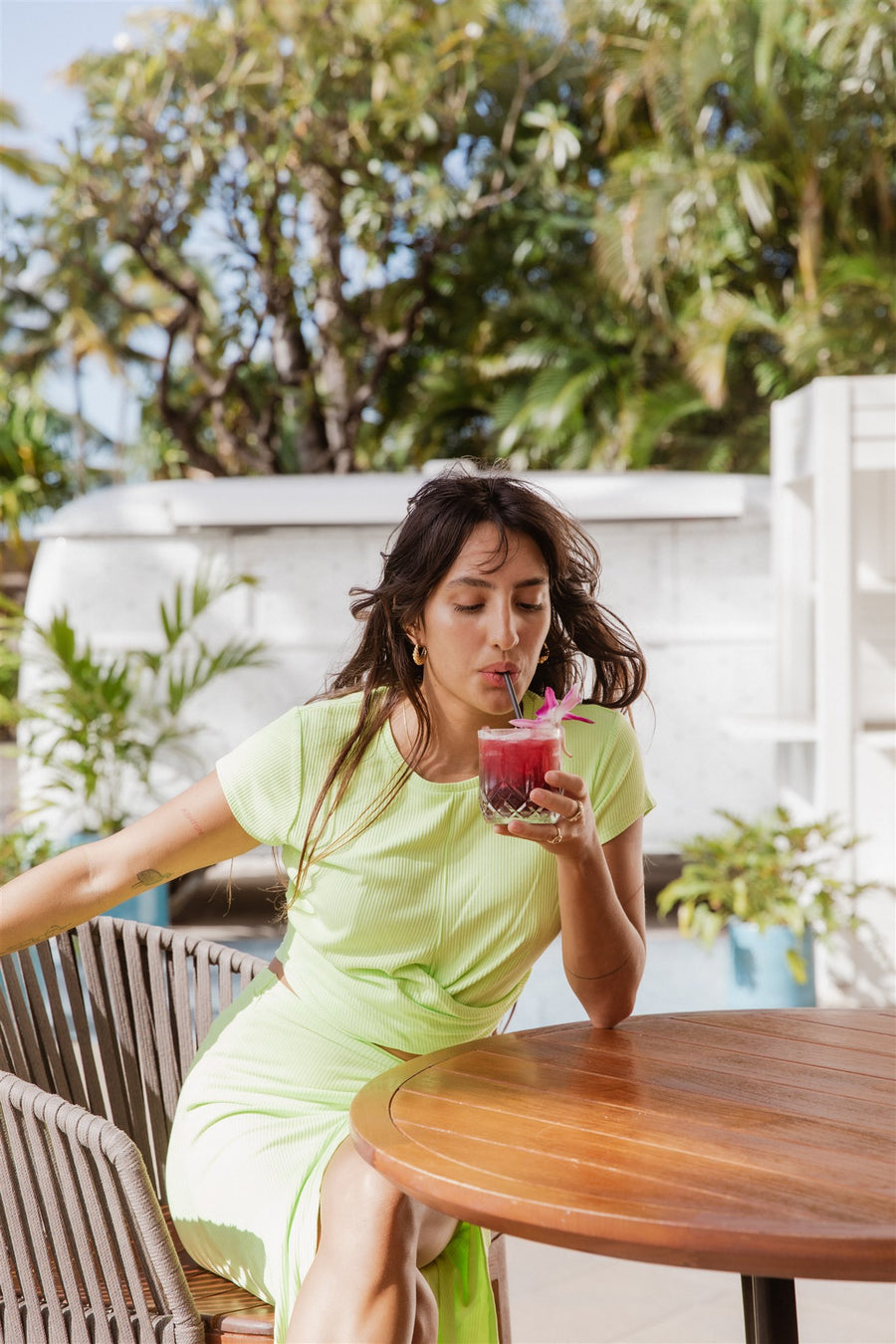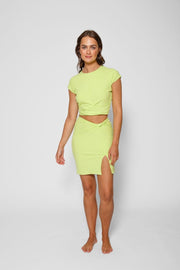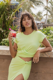 Vous planifiez une escapade? Emportez le haut court torsadé côtelé Laguna ! C'est un incontournable des vacances, avec ses manches courtes, son tissu côtelé, son ourlet torsadé et son col rond. De plus, il est suffisamment flatteur et chic pour les transitions plage-rue afin que vous puissiez aller de l'aéroport à votre destination avec style et facilité ! Disponible en margarita noire ou citron vert, associez-la à la mini-jupe Laguna Rib ou à la jupe longue Knot pour un look de vacances parfait. Bon voyage!